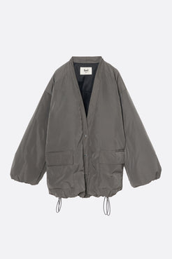 カーディガンのようなVネックと、ドローストリングでシルエット調整が可能な裾デザインが特徴で、性別問わずスタイリングに取り入れやすい一着です。